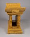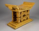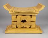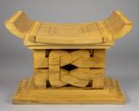 Physical DescriptionPhysical DescriptionDecoratively carved light brown wooden Ashanti stool. The sides of the seat curve upward and the base is a tiered rectangular platform. The middle portion of the stool is carved to resemble knots. Carved into the top of the seat is are geometric lines forming a square, and at the center a flower-like shape with four petals inside a square. There are triangles jutting out from the sides of the stool and carved into the sides of the base's tiers and edges of the top of the stool are rows of triangles that form squares.