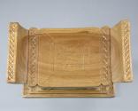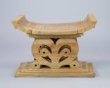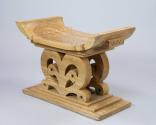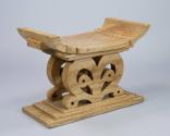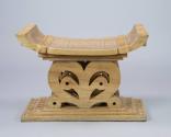 Physical DescriptionPhysical DescriptionDecoratively carved light brown wooden Ashanti stool. The sides of the seat curve upward and the base is three tiered rectangles. The middle portion of the stool is carved in curving heart shapes. Carved into the top of the seat is are geometric lines forming a square, and at the center a flower-like shape with four petals inside a square. There are triangles jutting out from the sides of the stool and carved into the sides of the base's tiers and edges of the top of the stool are rows of triangles that form squares.