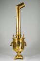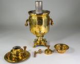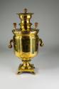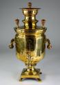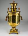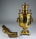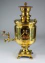 Physical DescriptionBrass samovar with a peasant barrel shaped and accented by wooden handles and knobs. The samovar is heated with coal, and comes with a tube-shaped chimney piece. There are maker's marks stamped throughout the body.