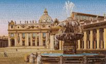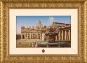 Physical DescriptionPhysical DescriptionFramed and matted mosaic depicting St. Peter's Square in front of St. Peter's Basilica in Vatican City. There is a fountain in the foreground and a few people walking around the square. The mosaic is made from small spun glass enamel tiles. The frame is ornate gilded gold with an interior white mat and the official seal of the Holy See at the bottom center.