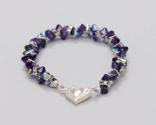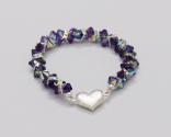 Physical DescriptionDark purple and square iridescent beaded bracelet with a silver-toned heart shaped metal magnetic clasp. The square beads are composed of two metal plates with small iridescent crystals between them.