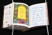 Physical DescriptionBrown leather bound book with silver plate depicting the city of Jerusalem. Floral motif in raised leather surrounds the plate and decorates the back cover. On the spine of the book in gold letters are the Hebrew words for Torah, Nevi'im (Prophets), and Ketuvim (Writings), the three sections of the Tanakh. On the inside title page the Tanakh is personally inscribed by Prime Minister Netanyahu. The Tanakh is meant to be displayed in an included glass case with wooden base.