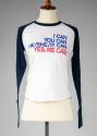 Physical DescriptionLong-sleeve white with navy blue sleeves and collar with blue and red words screen printed on the obverse "I Can - You Can - He/She/It Can - Yes, We Can!". Screen printed on the back in blue is "Nobel Peace Center".