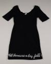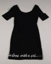 Physical DescriptionPhysical DescriptionBlack scoop neck dress with "All because a boy fell in love with a girl" embroidered in white script on bottom.