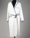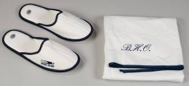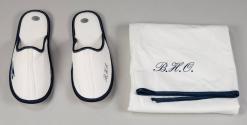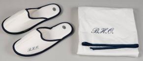 Physical Description“Spaziale Splendy” microfiber bathrobe, with a towel, and slippers. All parts of the set are white with navy blue trim and the initials "BHO" embroidered. On the robe the initials are on the proper right breast. On the slippers the initials are on the left slipper. On the towel the intials are towards one end. The robe has a single pocket. robe is white with navy blue trim with the initials, "BHO" on the chest and the brand name on the right side. There is also a pocket on the right side.