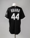 Physical DescriptionBlack with white and gray accents majestic brand White Sox jersey. On the front is "44" and "Sox" embroidered in white, gray, and black. On the back is "Obama 44" embroidered in white, gray, and black. White Sox logo on left sleeve.