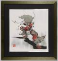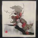 Physical DescriptionPhysical DescriptionArt print depicting a stylized samurai warrior with long curly hair standing in a fighting stance pointing a curved sword forward. The print is in grayscale with red accents throughout the body and clothes of the warrior. Print is held in a green wooden frame.