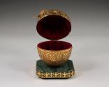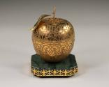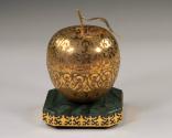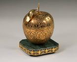 Physical DescriptionPhysical DescriptionGold-toned metal apple trinket with traditional Kazakhstan patterns etched on the outside and hinged top. Inside of apple is lined with a dark red velvet-like material. The apple is attached to a green stone base bordered with gold traditional patterns.