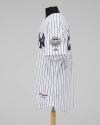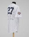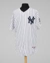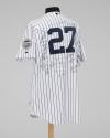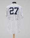 Physical DescriptionWhite and blue striped New York Yankees baseball jersey with a "World Series 2009 Fall Classic" patch on the right sleeve and a "Yankee Stadium 2009 Inaugural Season" patch on the left sleeve. The Yankees logo patch is applied to the left chest. In the center of the reverse is the navy blue number 27 patch with the autographs of the Yankees team across the back in black ink.