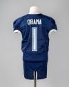 Physical DescriptionNavy with white and light blue accents football jersey for Villanova University. On the front is "Villanova 1" embroidered in white and light blue and the patch for the 2009 NCAA Division I Football Championship. On the back is "Obama 1" embroidered in white and light blue. "V" patches on both sleeves.