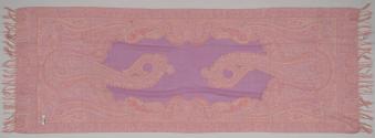 Physical DescriptionPink, cream, and light purple shawl with floral and paisley designs throughout. The pattern has large swirling paisleys at the center of each edge that are lined by gold-toned glass tube beads. Throughout the entire pattern there are spaced-out gold-toned sequins. The center of the shawl has no pattern and is a light purple color. At the short ends of the shawl there is fringe made of the pink and cream threads.