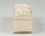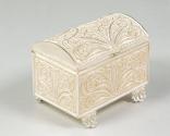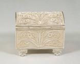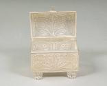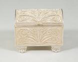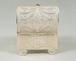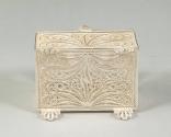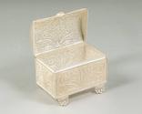 Physical DescriptionPhysical DescriptionSilver-toned decorative trinket box with an intricate lattice design of swirls on all sides and the hinged lid. The feet of the box are shaped like flowers.