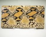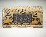 Physical DescriptionPhysical DescriptionOlive green and dark brown snakeskin leather clutch purse with silver-toned metal plate in laid on the front flap that has an engraved design based on a sculpture found at a Mayan ruin in Copán