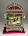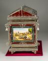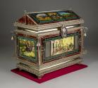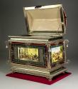 Physical DescriptionPhysical DescriptionOrnamental chest with painted ceramic plates on all sides depicting various Mexican scenes and themes as well as religious imagery framed in a red border. The edges of the chest are all silver with swirling embellishments and a bell in each of the top four corners. The latch at the front of the chest is oval shaped and contains the image of the Coat of Arms of the City of Jalisco as well as the city name in metal letters. Interior of the chest is all metal.