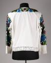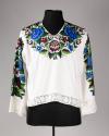 Physical DescriptionPhysical DescriptionWhite shirt with handsewn floral beaded design along the collar, over the back the shoulders, and down both sleeves. Pattern has a center pink flower at the point of the v-neck, two blue flowers higher up, and two red flowers at the shoulders. The wrists and bottom hem of shirt are lined with white floral-pattern lace.