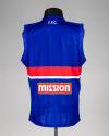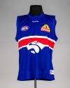 Physical DescriptionAustralia Football Jersey for the Western Bulldogs with a royal blue body and three center stripes, a large red one bordered by two white ones. The bottom white stripe expands into the shape of a bulldog, the team logo, in the center. Over the proper right breast is the AFL logo and over the proper left breast is the logo for Mission Foods The red and bottom white stripe continue on the reverse where there is another variation of the Mission Logo.