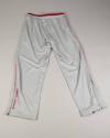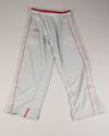 Physical DescriptionLight gray athletic pants with red elastic at the waist, red stitching down the outer seams, and the brand logo in red at the right pocket.
