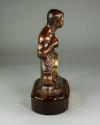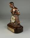Physical DescriptionPhysical DescriptionCopper-colored Muhammad Ali-shaped clock on wooden base with bronze plaque attached. Muhammad Ali is depicted in a fighting stance with raised fists. HIs body morphs into the clock with laurels on either side that have boxing gloves attached to the base.The removable clock is battery-operated and its face bears the numbers in black script on a white background.
