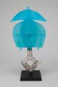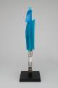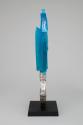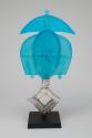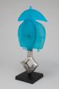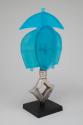 Physical DescriptionBlue glass sculpture (.a) recreation of a traditional Gabonese mask on top of metal base (.b). The mask is a stylized human face with a concave oval center, an elevated triangular nose, and eyes represented with two semi-circles and raised bumps for pupils. A transverse crest on the top and two crescents with flat bottoms framing the face represent hair and hair adornments. Base represents the neck and is a textured silver colored metal, forming a diamond at the bottom.
