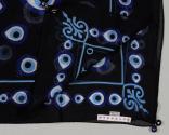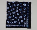 Physical DescriptionBlack silk scarf with a pattern in two shades of blue and white depicting the Evil Eye in various shapes. At all four corners there are glass and metal charms, also depicting the Evil Eye.
