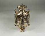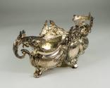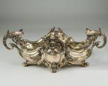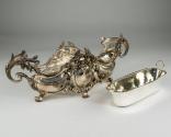 Physical DescriptionPhysical DescriptionOrnate silver serving dish with an inset vessel for holding sauce or other food that can be lifted out using the loops at either end. The dish is oblong and has leaf and floral designs around the edges. It stands on four feet with an ornate handle on either end.