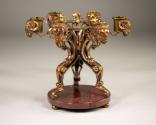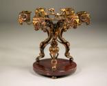 Physical DescriptionPhysical DescriptionBronze candlestick holder with a three legs that sit on a circular stone base . Atop the three legs sits a ring on which an eight camel caravan is displayed. Each of the six candle holders is a ram's head that originates from the main ring. Each candle holder is equidistant from the middle of the piece and from one another.