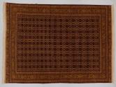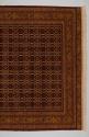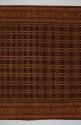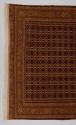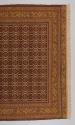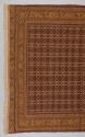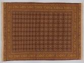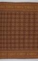 Physical DescriptionPhysical DescriptionBrown, beige, burnt orange, green, and black Afghan rug with beige fringe running the length of both short ends. The rug has a multi-layered border that contains many intricate designs throughout with the center section of the border, as well as the outside edge of both short ends, containing diamond patterns and stepped designs. The field is filled with rows of intricate geometric designs within rectangles and elongated hexagons. There is a beige trim that runs along the outside edge of both short ends.