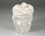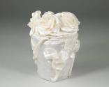 Physical DescriptionPhysical DescriptionWhite cylindrical purse with velvet siding adorned by flowers. Lid of the purse is attached and also decorated with flowers. Purse is carried with a single center strap.