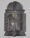 Physical DescriptionPhysical DescriptionMetal picture frame with kickstand at back and curved decal at top painted with floral and gold designs. Held within the picture frame is a small printed image depicting President Barack Obama in front of a stylized American flag with his campaign logo above him and slogan below.