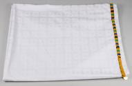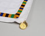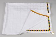 Physical DescriptionWhite tablecloth with subtle pattern of white boxes and a narrow border of patterned blue, green, yellow, and black kente cloth. Each corner has a gold metal replica of a 1922 two shilling coin from British West Africa.