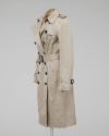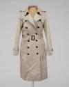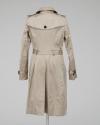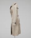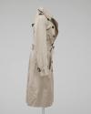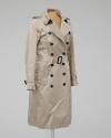 Physical DescriptionBeige cotton trench coat (.a) with two rows of seven buttons down the front, leather buckles at the wrists, and a removable belt with matching buckle (.b). The reverse of the coat has a button holding down the back vent and two loops for the belt. The inner lining of the coat has a repeating embroidered logo depicting a knight on a horse.