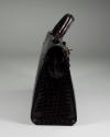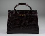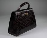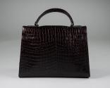 Physical DescriptionPhysical DescriptionBrown crocodile leather trapezoid handbag with two triangular gussets on the side. The front of the bag has a cutout flap with two sangle straps that close over a centered touret. The ends of the sanglons and the touret clasp are gold. At the top of the bag is a single D-shaped handle in crocodile leather attached with gold rings.