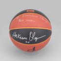 Physical DescriptionA black and orange basketball (.a) signed by Nigerian-American NBA star Hakeem Olajuwon (formerly of the Houston Rockets and Toronto Raptors). The ball is displayed on an acrylic stand (.d), housed in a clear and mirrored glass case with an engraved nameplate at front. The octagonal base (.c) features a wooden base, with a mirrored glass top. The glass cover (.b) has three mirrored panels at the rear, with the remaining five panels made of clear glass, and a clear top.
