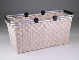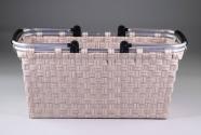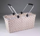 Physical DescriptionPhysical DescriptionA plastic woven picnic basket with aluminum handles. The plastic weave material is printed with beige and cream lines to resemble wood.