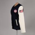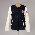 Physical DescriptionWomen's varsity-style jacket with a blue wool felted body and white leather sleeves. Over the right breast there is a white Nike swoosh. Over the left breast is a patch with the logo for the United States Olympic Team which includes an American flag and the interlocking Olympic Rings. A patch on the left shoulder is in the shape of the American flag. Embroidered on the back in white is "The United States of America". Jacket closes with a row of snaps down the front. At each wrist there is a zipper on the outer seam.