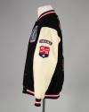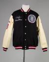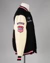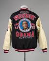 Physical DescriptionVarsity-style jacket made by Big Boy Headgear, Inc. and personalized for President Barack Obama. The body of the jacket is black wool with cream faux-leather sleeves and striped black, red, and white elastic at the neck, waist, and wrists. On the left lapel is an embroidered Seal of the President of the United States and on the right lapel embroidered in white is President Obama's signature above "Barack Obama." The upper arms have embroidered patches in red, white, and blue: on the left, a rectangular "Obama" patch above a crest-shaped "President Obama 44th" patch and on the right, a rectangular "Forward" patch above a crest-shaped USA patch. The reverse has an embroidered portrait of President Obama surrounded by text, "Forward" "President Obama" "44th" "Change We Can Believe in."