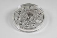 Physical Description[a] Pure silver coin, weighing 1 kg. The obverse shows the Aztec calendar and the reverse shows an arrangement of symbols of the United Mexican States, past-to-present. The coin comes inside a casing [b] with wood top [c], sits on a stand [d], and comes with a magnifying viewer eyepiece [e].