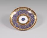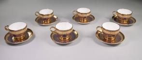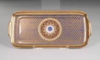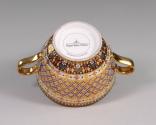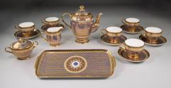 Physical DescriptionHand painted ceramic tea set decorated with intricate lines, geometric patterns, and flowers painted blue, yellow, orange, red, green, and white with 18 karat gold decorations and gold handles. The tray, saucers, and teapot are decorated with the Seal of the Office of the Prime Minister of Thailand above the words "Royal Thai Government." The set is composed of a teapot with lid, tray creamer, sugar dish with lid, six tea cups, and and six saucers.