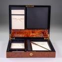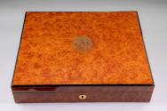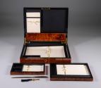 Physical DescriptionA stationery box set. The outside of the box is shellacked wood with black detailing around the edges. The Royal Thai Government emblem is printed in gold on the top of the box. The inside of the box is the same shellacked wood with black detailing with two removable trays containing two types of envelopes, paper in small, medium, and large sizes, and a letter opener. The box also comes with a gold key with a black tassel.