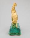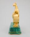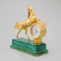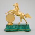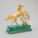 Physical DescriptionPhysical DescriptionGold-plated clock with mother of pearl face and a gold rearing horse sculpture on green stone base.