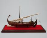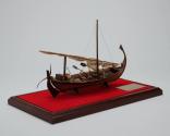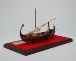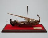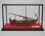 Physical DescriptionMiniature model of a traditional Maldivian sailboat. The boat has one canvas sail, two pairs of oars on either side of the boat, a five-pronged metal anchor, and a curved rutter. The model stands on a red felted base with a dark wooden trim and has a acrylic cover. In the right corner of the base there is a medal plaque debossed in black with dedication information.