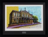 Physical DescriptionPhysical DescriptionColorful pop art print depicting the National Theater in San Jose, Costa Rica. The theatre is drawn in an architectural style with hatched lines. The background of the piece is composed of decorative swirling motifs in gold over purple and yellow. The right side of the background is a blue-toned map of San Jose. In the bottom right corner over a grayscale map is the city name. There is an engraved metal plaque beneath the art.