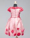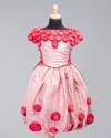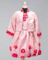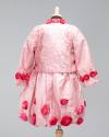 Physical DescriptionChild's ensemble dress and jacket set in light pink with floral detailing. Dress has short sleeves, a high neckline, and puffy skirt. Dark roses made of rolled fabric adorn the neck, shoulders, and skirt. At either side of the bodice are corset ties. A row of buttons goes up the back. The matching jacket is long sleeved with buttons up the front and roses at the neck and wrists.
