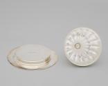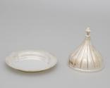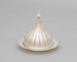 Physical DescriptionPhysical DescriptionSilver-toned metal candy dish with a conical lid shaped like a flat-bottomed teardrop with multiple vertical impressions that run nearly the entire length of the teardrop. The lid sits within the inner lip of the bowl, which has a wide rim. At the top of the lid there is a diamond-like shape with each corner at its center flaring slightly out.