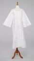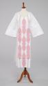 Physical DescriptionPhysical DescriptionWhite waxed textile tunic dress with a pink embroidered oval pattern on the front. The ovals have a orange, white, and blue center, with gold thread detailing. Framing the pattern are red embroidered lines which continue on the back. The wrists each have red embroidered trim and there is a blue trim along the collar.