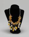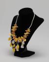 Physical DescriptionSilver and yellow necklace containing alternating brushed metal petals and amber-colored stones. There are additional brushed metal petals and amber-colored stones towards the bottom of the necklace that hang below the necklace line on silver-toned wires. The top of the necklace has slightly curved metal tubes, spearated by metal balls, that encompass the necklace wire. The clasp of the necklace is made up of two magnetic halves of a metal ball.