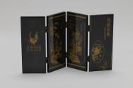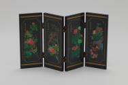 Physical DescriptionPhysical DescriptionBlack lacquer replica of a four panel traditional Chinese folding screen. The front of the panels are all painted with different colorful depictions of floral scenes with birds. The top and bottom of each panel has a muted gold-toned painted geometric design. The back of the panels are painted in the same muted-gold tone with depictions of birds at night and poetry.