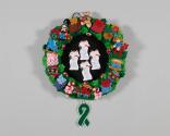 Physical DescriptionPhysical DescriptionHand-sewn Christmas wreath memorializing the victims of the Sandy Hook Elementary School shooting. The wreath is made of green felt on a black felt covered board. Attached to the center of the board are four ceramic ornaments bearing the handwritten names of the 26 victims. The wreath is decorated with felt holly leaves and various colorful felt decorations in the shapes of presents, ornaments, and other Christmas themed shapes. The figures are made of felt and decorated with sequins, beads, and thread. From the wreath hangs a green Sandy Hook remembrance ribbon. On the reverse is hardware for hanging.