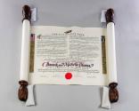 Physical DescriptionDouble rolled scroll signed by President Barack Obama and First Lady Michelle Obama that is the ceremonial key to the city of Cape Town, South Africa. The scroll is mounted on hand carved wood batons with ends shaped like protea plants. It is on hand illumiated parchment, wrapped in tan and black raffia cloth with a diamond-shaped pattern and a hand beaded belt. The belt is decoarated with primarily white beads with black beads making diamond shaped decorations. The scroll is signed at the bottom with a sticker of a seal between them. Painted decorations on each side and along the top. The US flag is in the upper left and the flag of South Africa is in the upper right.