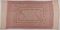 Physical DescriptionPhysical DescriptionBeige pashmina shawl with an elaborate embroidered design throughout in red, orange, and brown. The center of the design depicts thin branches with leaves and large swirling paisleys that cross over into the other rows of the design. Each row of the embroidery has floral motifs and are separated by looping lines. The short edges of the shawl are unadorned.